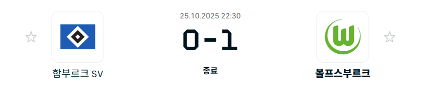 25-26시즌 10월25일 분데스리가 8라운드 - 함부르크 vs 볼프스부르크 결과.팀전적.순위
