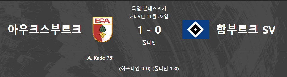 25-26시즌 11월22일 분데스리가 11라운드 - 함부르크 vs 아우크스부르크 결과.팀전적.순위