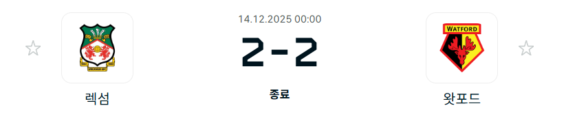 25-26시즌 12월14일 EFL 챔피언십 21라운드- 렉섬AFC vs 왓포드 결과.팀전적.순위