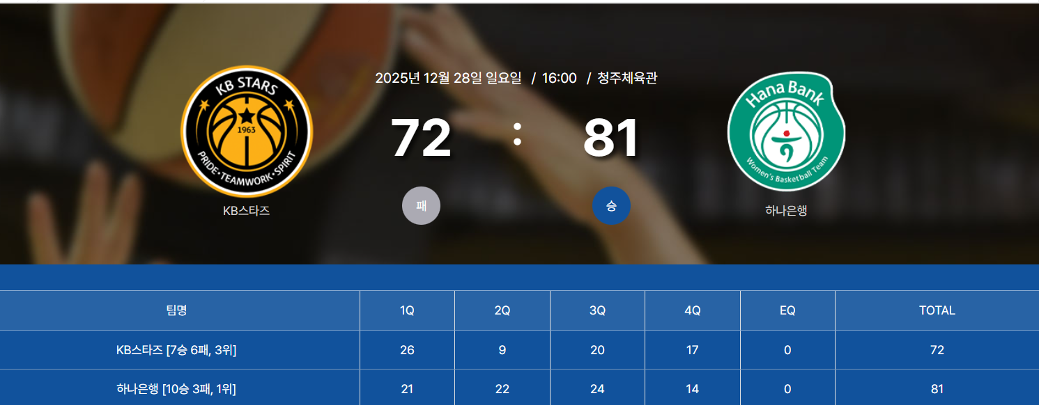 25-26시즌 12월28일 WKBL 3라운드 3경기 - 하나은행 vs KB스타즈 결과.팀전적.순위