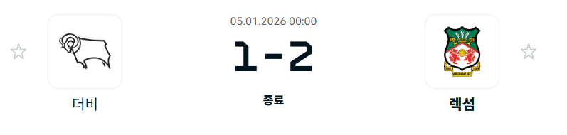 25-26시즌 01월05일 EFL 챔피언십 26라운드- 렉섬AFC vs 더비 결과.팀전적.순위