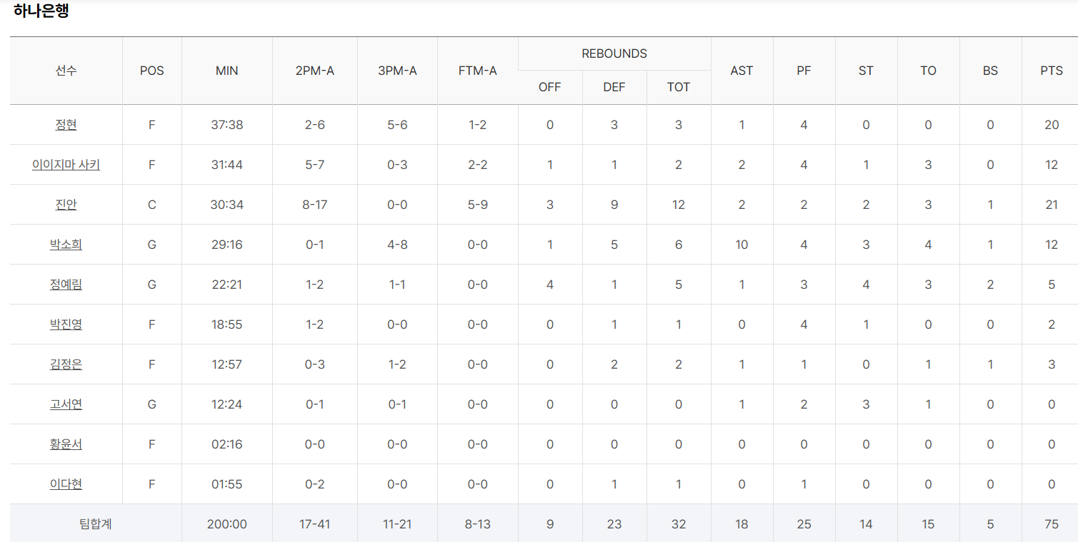 25-26시즌 01월10일 WKBL 3라운드 4경기 - 하나은행 vs 삼성생명 결과.팀전적.순위